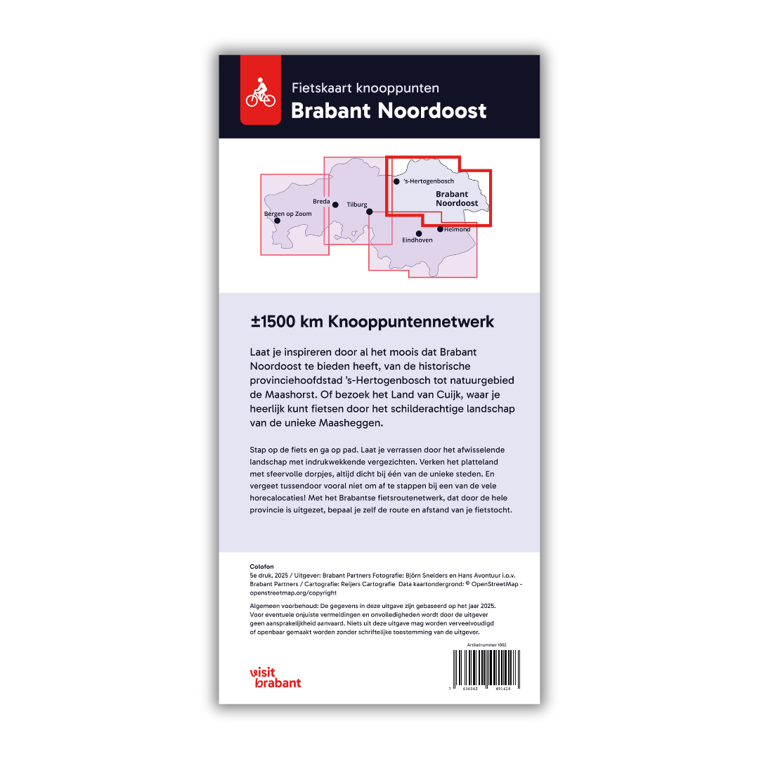 Ontdek het veelzijdige Brabant Noordoost. Van historische steden tot uitgestrekte natuurgebieden, charmante dorpjes en verrassende landschappen. Met deze kaart heb je alle fietsknooppunten in Brabant Noordoost bij de hand en stel je makkelijk je eigen route samen, zodat je zorgeloos kunt genieten van alles wat deze regio te bieden heeft.