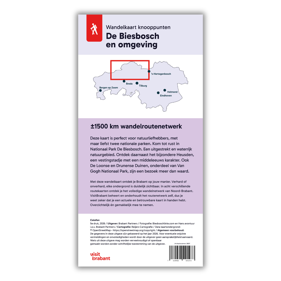 Verken het afwisselende landschap rond de Biesbosch, een van de meest bijzondere natuurgebieden van Nederland. Dit zoetwatergetijdengebied staat bekend om zijn kreken, wilgenbossen en waterrijke natuur. In de omgeving wandel je door rustige polders, over dijken en langs historische stadjes en dorpen. Met deze wandelkaart heb je alle wandelknooppunten overzichtelijk in beeld en stel je eenvoudig een route samen die past bij jouw afstand en tempo.