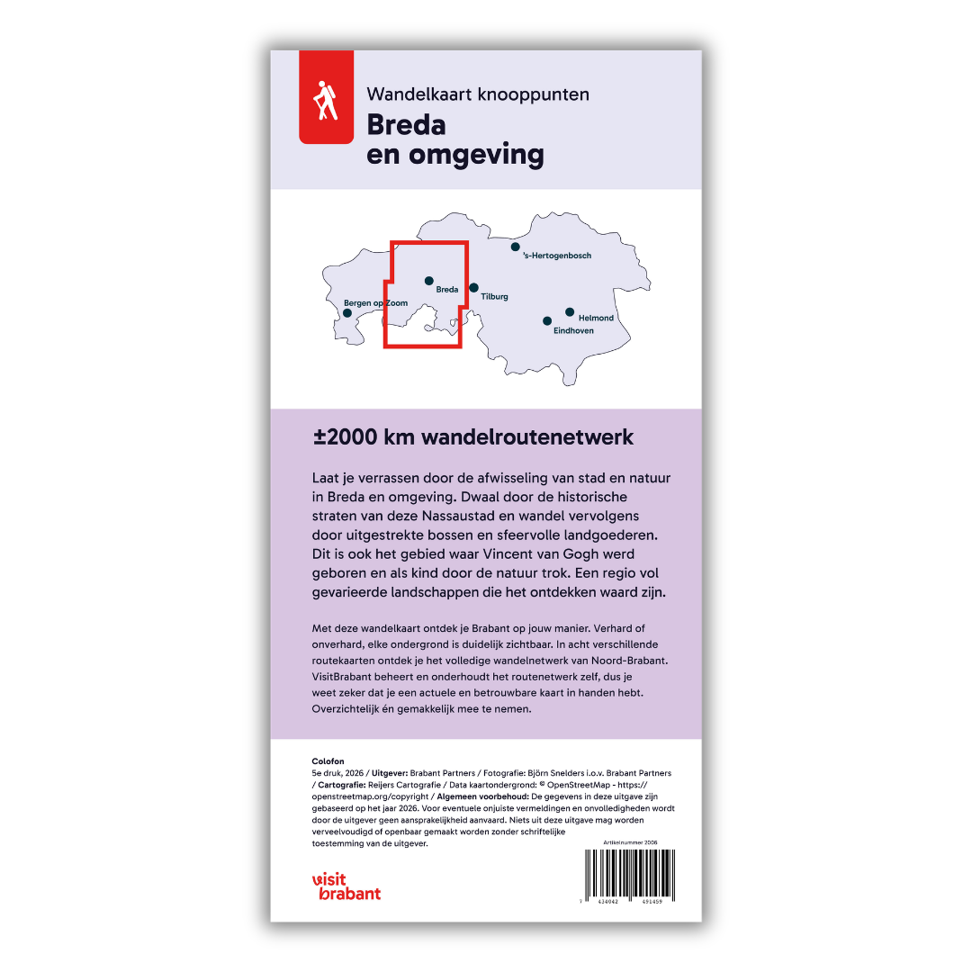 Verken Breda en omgeving, inclusief het streek- en natuurgebied De Baronie. Dit gebied rondom Breda, Etten-Leur en Chaam biedt een afwisselend landschap van bossen, landgoederen, beekdalen en agrarisch gebied. Met deze wandelkaart heb je alle wandelknooppunten overzichtelijk in beeld en stel je eenvoudig een route samen die past bij jouw afstand en tempo. Ideaal voor een kort rondje in de stad, een dagtocht of een langere wandeling door de natuur.